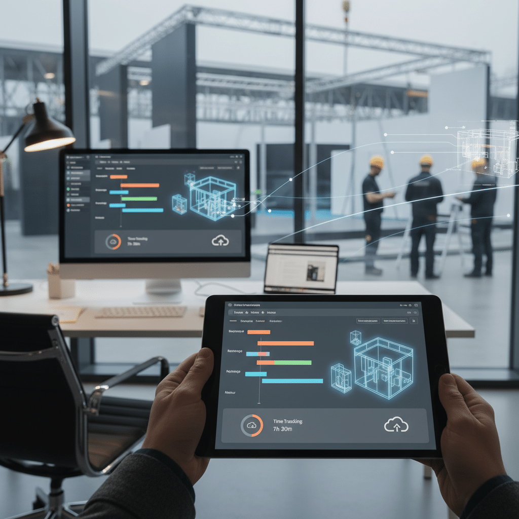 Excel, WhatsApp und separate Kalender: Typische Insellösungen scheitern im Messebau. Datenfragmentierung führt zu Fehlern – ein Messetermin kollidiert mit Lieferung. Laut BMWK-Mittelstand-Digitalisierung sind 62 % der Betriebe von Silos betroffen.5 **All-in-One SaaS-Lösungen** wie **Bausoftware** in der Cloud lösen das.