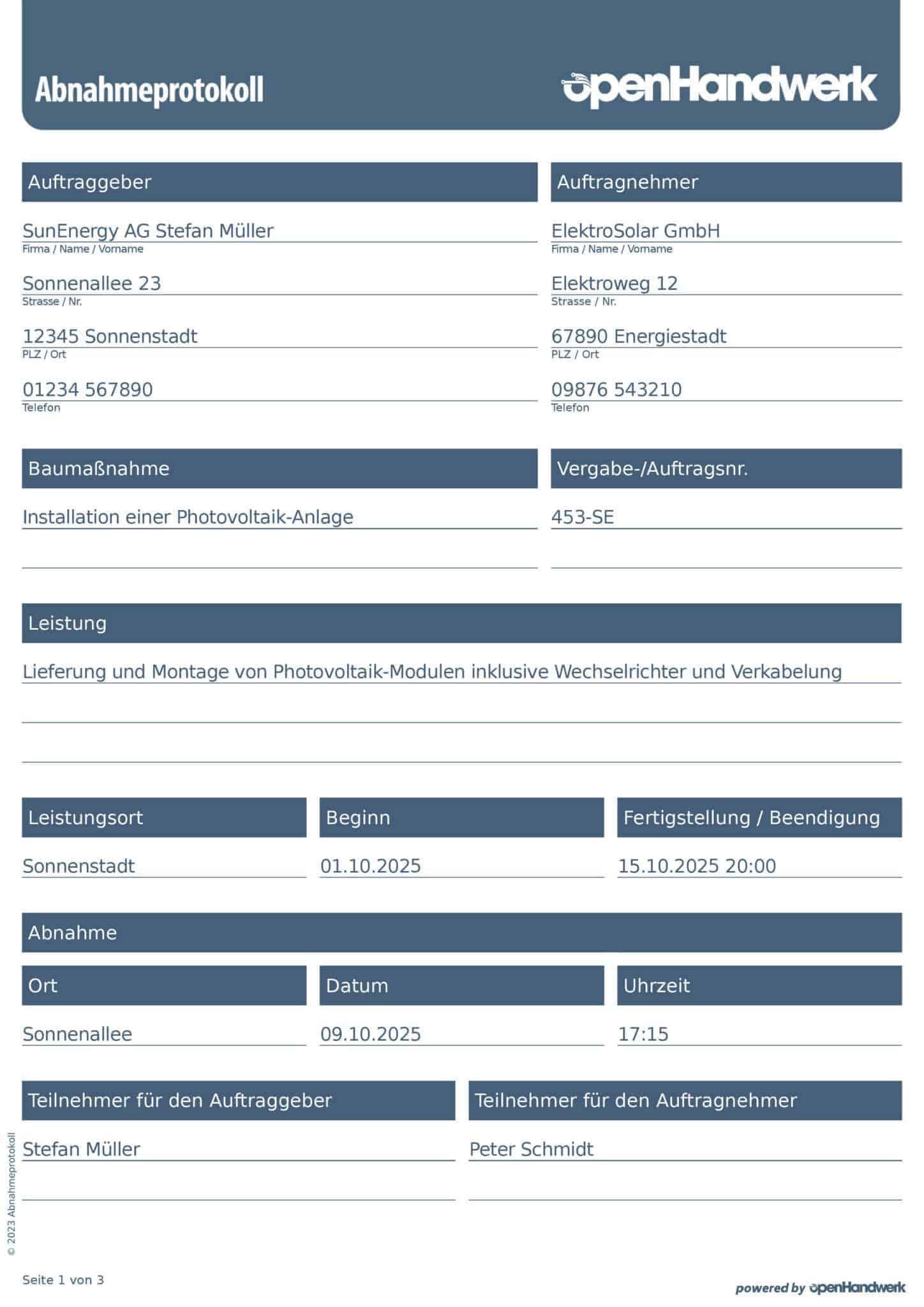 Wer schreibt, der bleibt! Mit openHandwerk füllen Sie Formulare aus und erhalten E-Signaturen. E-Signaturen können die Freigabe vom Auftraggeber, die Abnahme, die Unterschrift vom Bauleiter, Hausmeister oder Mieter sein – oder die Bestätigung durch Ihren Mitarbeiter oder Nachunternehmer.