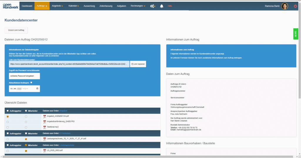 Unbezahlbar wird die Lösung im Mehrwert, wenn Sie auf einmal Dokumente finden, die Sie vielleicht im Vorfeld nicht gefunden haben und diese Ihren Umsatz sichern. Jetzt reden wir von Prozessen! In openHandwerk gehören alle Dokumente, Bilder und Formulare in Angebots- oder Auftragsakten, um Ihren Auftrag fachgerecht ausführen zu können, um Ihre Arbeit zu dokumentieren und Ihre Rechnung abzusichern, um ihr Risiko zu minimieren und zu lernen, wie man den Auftrag nächstes Mal besser abwickeln könnte. Und das Schöne daran ist – Sie können das Dokumentencenter nach Ihren Freigaben und Wünschen mit Dritten teilen – offen, befristet in der Laufzeit oder mit einem Passwort!
