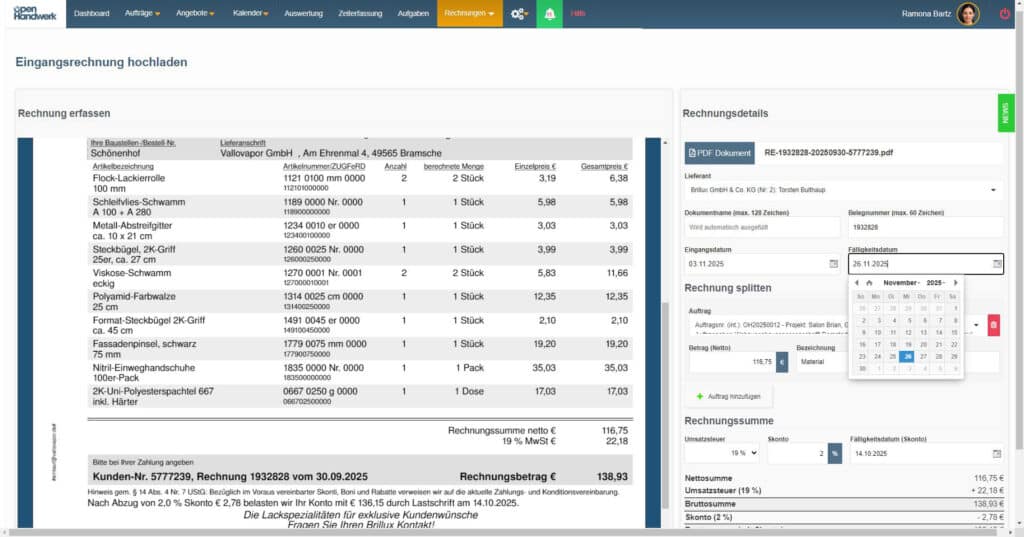 Eingangsrechnungen sind ein wesentlicher Bestandteil Ihrer Kalkulation. Handwerksbetriebe laden Ihre Eingangsrechnungen in openHandwerk hoch und buchen diese auf Projekte. Sie können dabei Belege direkt auf Angebots- und Auftragsmappen buchen oder die Eingangsrechnung auch auf mehrere Baustellen und/ oder Projekte splitten. Mit openHandwerk erhalten Sie somit einen Überblick über Ihre Eingangs-Buchhaltung.
