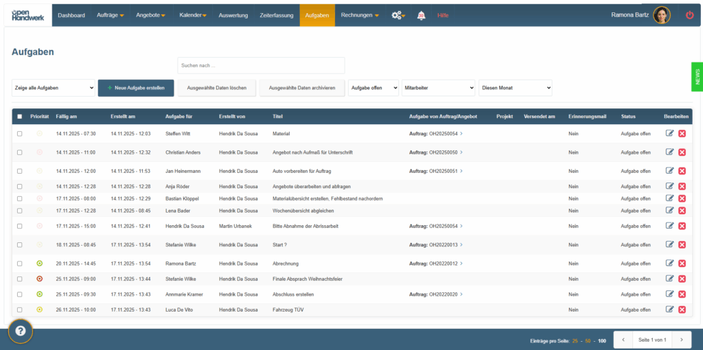 Alle Aufträge auf einen Blick mit dem dazugehörigen Status. Nie wieder Aufträge vergessen oder übersehen.